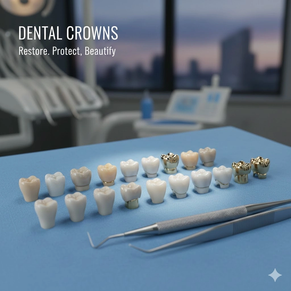 Dental crowns are custom-made caps placed over damaged or weakened teeth to restore their strength, shape, and appearance. They are commonly used after root canal treatment or when a tooth has significant decay or fractures.